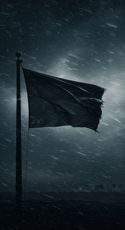 A desolate scene unfolds with a dark, worn flag flapping powerfully in a severe winter storm, featuring a gloomy atmosphere, dramatic lighting, and abundant falling snow.