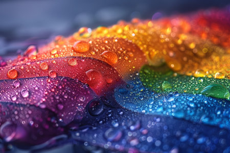 A close-up image of a rainbow-colored fabric covered in water droplets.