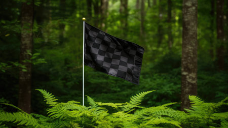A checkered racing flag waves triumphantly in air, surrounded by vibrant confetti celebrating victorious moment