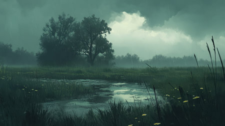 This atmospheric landscape captures a solitary tree in a murky wetland, reflecting ominous clouds above, evoking emotions of tranquility and solitude.