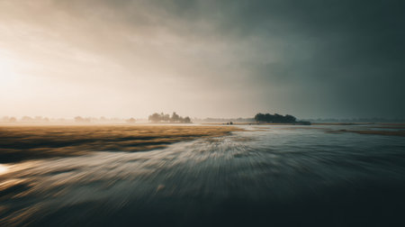 A captivating dawn scene showcases a misty river flowing through serene fields, with shadowy trees in the distance. The overcast sky enhances the tranquil atmosphere.