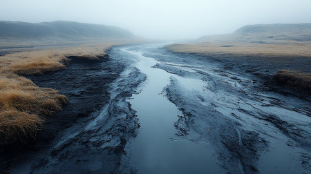 A serene Icelandic landscape featuring a winding river through dark, volcanic soil, bordered by golden grass under a heavy mist, creating an ethereal, otherworldly atmosphere.