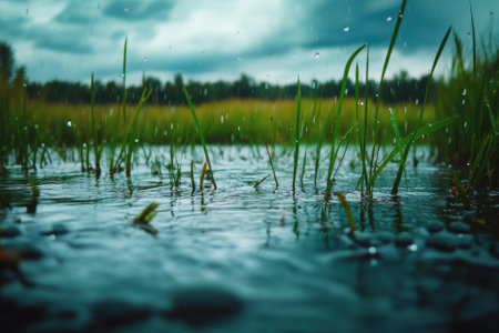 Close-up of raindrops falling on a tranquil pond with green grass.