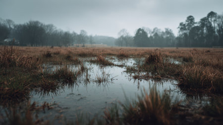 the fog blankets the marsh of west virginia, creating an ephemeral installation reminiscent of australian tonalism and the art of the ivory coast. this photograph captures the essence of new american documentary photography, with its atmospheric color washes and depiction of decaying landscapes. the uhd image showcases the intricate details of this captivating scene. ai generated