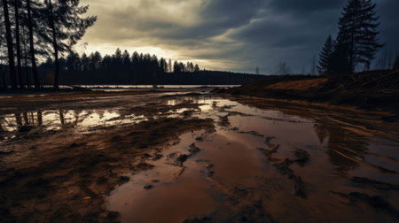 muddy marsh, with the sun peeking through clouds and shining on the water, created with generative ai