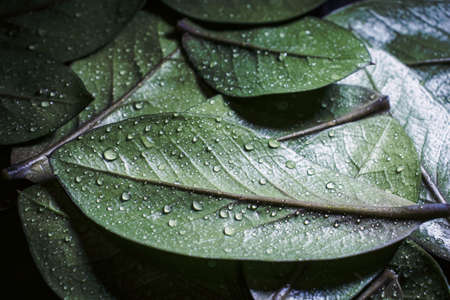 Background made of fresh wet green leaves. Creative and moody color of the picture. Top view.