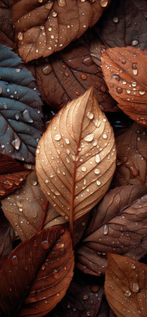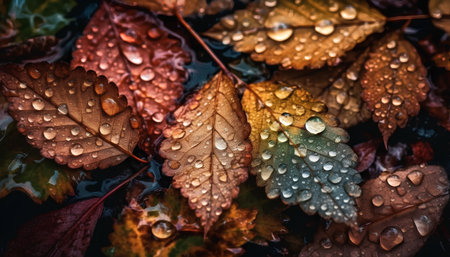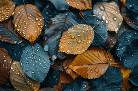 A Colorful autumn leaves with raindrops create vibrant, textured pattern