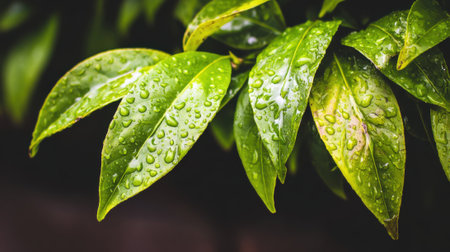 Captivating close-up shot of dewy green leaves with water droplets, set against a dark backdrop, exemplifying the beauty of nature and tranquility.