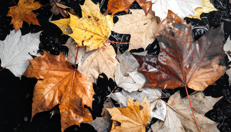 Vibrant autumn leaves floating on wet surface in rainy weather