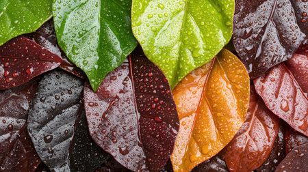Vibrant leaves in autumn shades with droplets of water create a stunning natural display. Perfect for seasonal themes and nature-inspired projects.