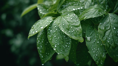 Rain falls on vibrant green leaves covered in glistening water droplets creating a fresh and natural scene perfect for environmental or botanical projects.