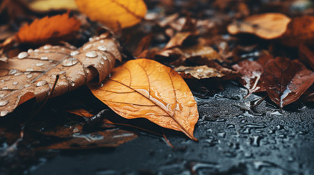 autumn leaves on the ground, adorned with water droplets, captured in the style of moody tonalism. this photorealistic image showcases intricate details, with a color palette featuring dark silver and dark gold. the classic still-life composition offers close-up shots, highlighting the beauty of nature. the dark sky-blue and dark orange tones add a touch of tropical symbolism to the scene. ai generated