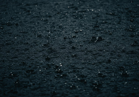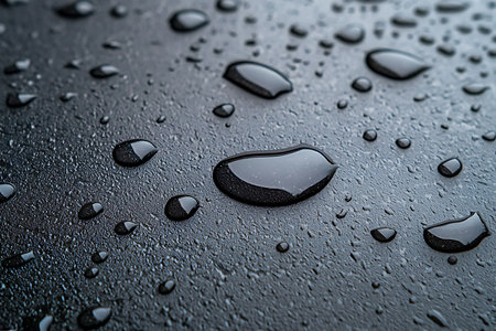 Close-up photo of multiple water droplets resting on a smooth black surface, creating a mesmerizing pattern, A raindrop falling on a nano-engineered waterproof surface, AI Generated