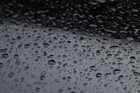 Water drops on black glass surface, closeup