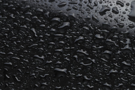 Water drops on black surface background. Raindrops for overlaying on window, concept of autumn weather,