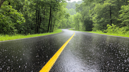 Wet asphalt with a yellow centerline in sharp focus, surrounded by blurred greenery and rain droplets. this perspective emphasizes the feeling of solitude and adventure, ideal for themes of travel, journey, or weather. Generative AI