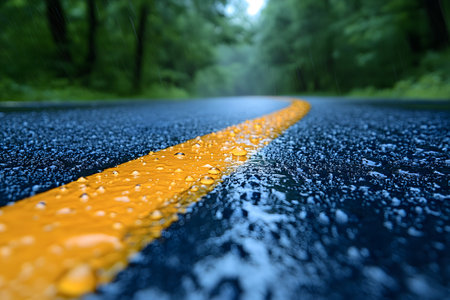 Close-up view of a road's yellow divider line drenched in rain. water droplets glisten on the asphalt, emphasizing texture and contrast. the blurred background suggests a moody, overcast ambiance, enhancing the focus on the wet surface. Generative AI