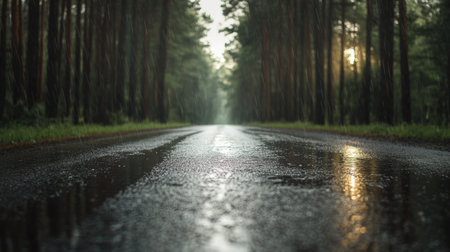 A peaceful stretch of road surrounded by lush trees during a soft rain, creating a calming atmosphere in the forest. Water droplets bounce off the pavement, enhancing the natural beauty.
