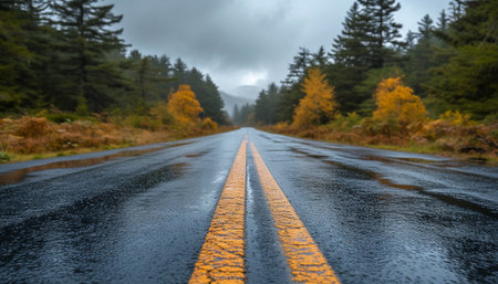 Rain-drenched road with prominent yellow paint spills on the centerline, emphasizing the effects of wet weather on transportation infrastructure. the scene highlights road safety concerns and the impact of inclement weather on driving conditions. Generative AI