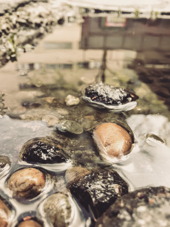 Colorful sea pebbles on the shore close up. Top view, flat lay. Abstract background texture, sea stones in water.