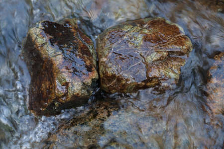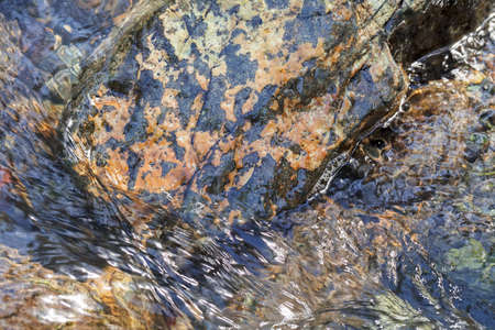 Stones on bottom of mountain lake with clear water. Nature background with ripple on transparent water surface. Natural texture of stony lake bottom. Full frame of stones closeup distorted in water.