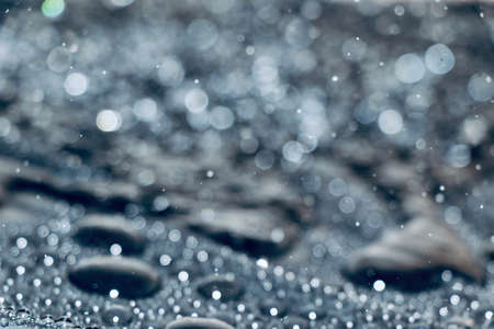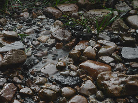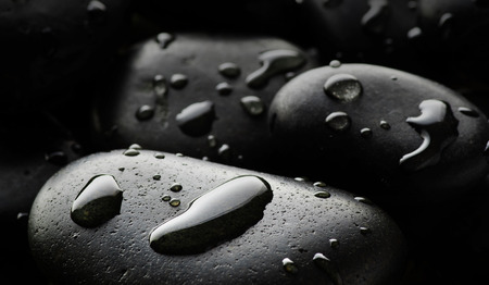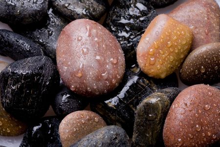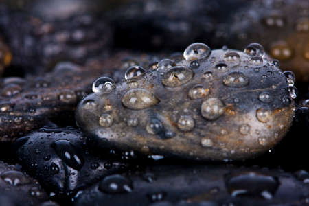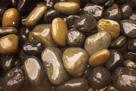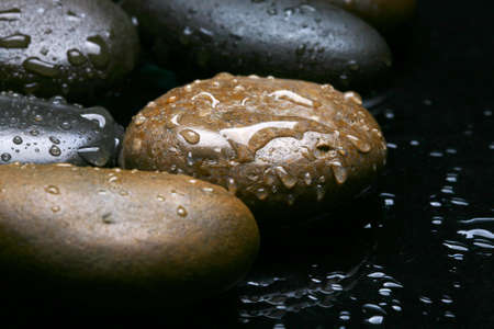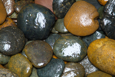 Wet colored stones background, dark pebbles with water drops. Close-up