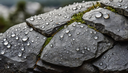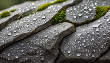 A macro photograph showcasing numerous glistening water droplets resting on the uneven surface of gray rocks with spots of green moss, AI generated image