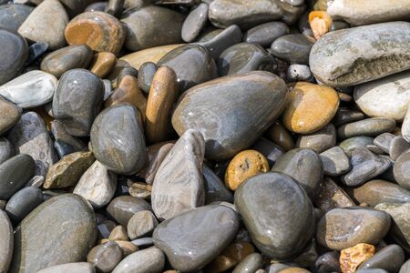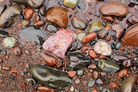 Wet colorful pebbles. Rocky beach by the sea. Perfect for a background for banner, poster, flyer, website. Top view.