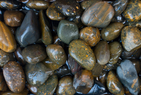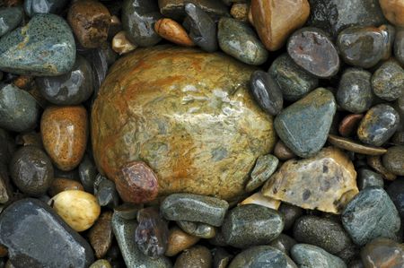 Wet colorful pebble detail at the seaside or in a landscaped garden with assorted colors and textures of irregular shaped stones and rocks