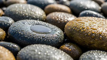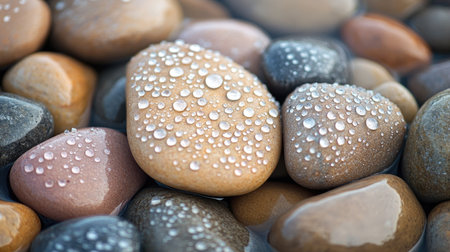 Close-up of smooth river stones covered with tiny water droplets, glistening under soft natural light, creating a serene and refreshing texture
