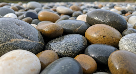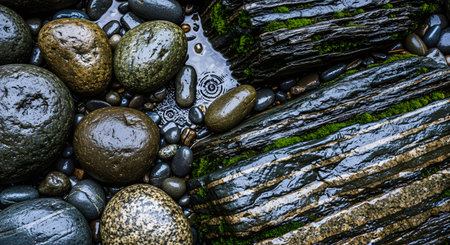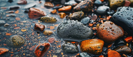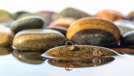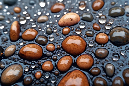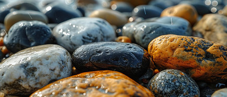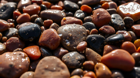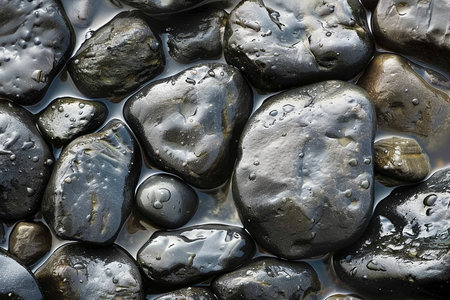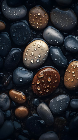 Macro image of river stones glistening with small water drops, highlighting natural details, smoothness, and wet textures