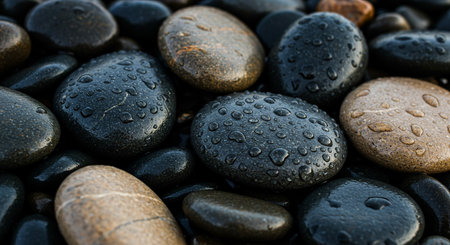 Smooth wet pebbles with water droplets creating a soothing natural texture