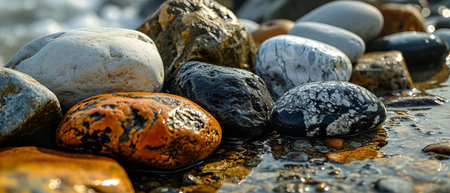 Close-up view of colorful wet pebbles and smooth stones on a beach shoreline with shallow water gently flowing between them