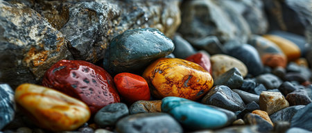 An eye-level close-up captures colorful, wet rocks and pebbles, offering an overhead view. Rocks feature hues of yellow, green, brown, grey, and blue, with some being submerged in water.