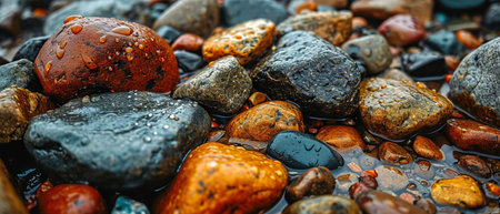 A vibrant collection of wet pebbles and rocks in various colors and patterns, glistening with moisture.