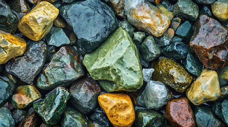 a close-up view of vibrant, wet rocks scattered across a sandy beach