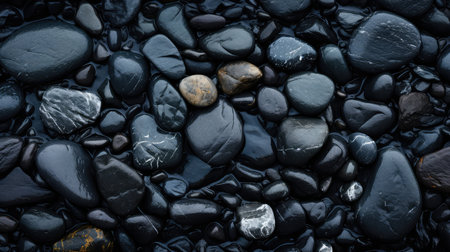 Close-up of wet, polished pebbles on a beach in earthy brown and black tones. Natural landscape texture for relaxation, meditation, and nature appreciation