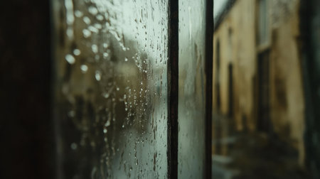 Raindrops cling to a window while an empty street stretches into the distance, creating a calm and reflective mood during rainy weather.