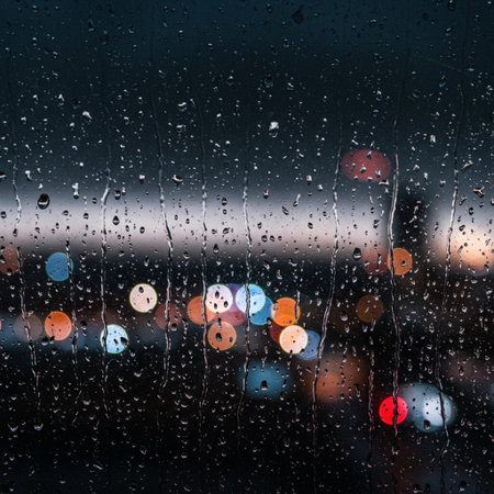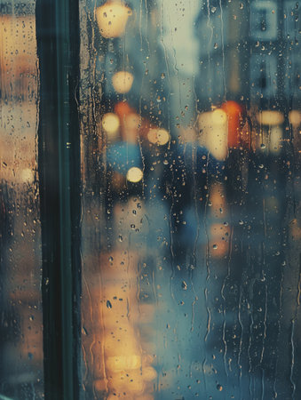 Rain drops on the window, blurred city lights in the background.