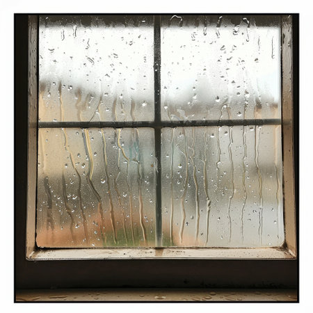 A lone figure stands before a rain-soaked window, lost in thought as raindrops trickle down the glass, embodying solitude and introspection.