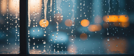 Rain drops cascade down a window against a backdrop of illuminated street lights, creating a contrasting scene of nature and urban elements.