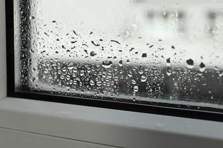 Condensation on the window. Water drops on the glass. Rainy weather.