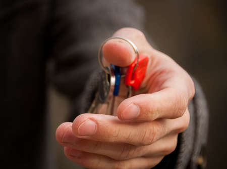 Close-up Of Hands Giving Keys Of An Apartment Against Gray Background