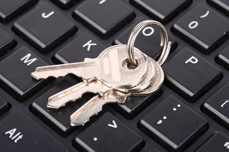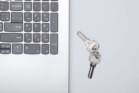 The concept of protecting your laptop. Security information. Laptop with bunch of keys on white background. Top view