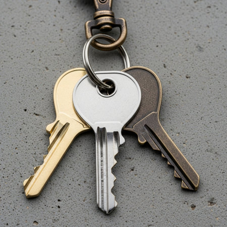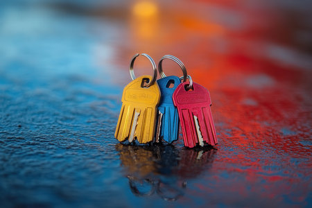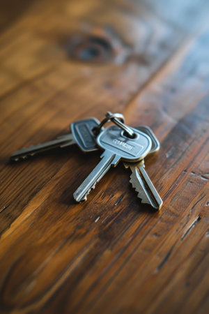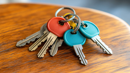 A vibrant assortment of keys on a sleek wooden surface, emphasizing organization and security in everyday life. Perfect for themes of security and efficiency.