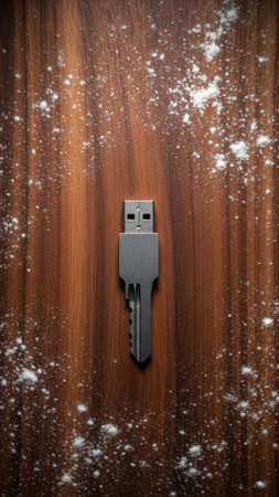 A vertical tall shot (9:16) capturing a polished, unbranded metallic USB drive centered on a dark wo