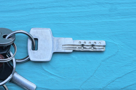 Door metal keys are located in a line on a colored background. Flat lay concept.