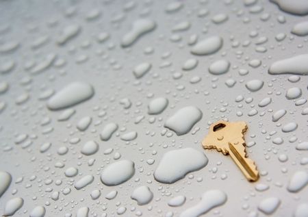 a single metal key rests on a bright surface, casting a soft shadow in a minimalist style image