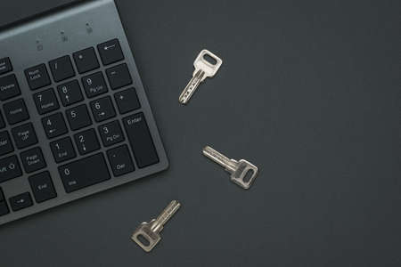 Three keys and a keyboard on a dark gray background. The concept of computer security. Flat lay.