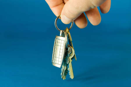 The hand holds the keys with the house keychain. Purchase of apartments.